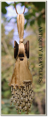 For my third design, I was working with this large, more irregular shaped spool. I did struggle just a bit with it trying to figure out what direction I wanted the design of the spool to be until I remembered an image I saw of a young Native American girl. She had beautiful dark hair tied up on either side in what is called a "Squash Blossom" style. The hairstyle is a Hopi custom which represents the sign of a girl's marriageability. The young girl will twist her hair in the shape of squash blossoms, which is the sign of fertility for an unmarried girl in the tribe. I wanted natural colors and fibers in this piece, so I used a linen colored silk from Darn Good Yarn, a mix of seed beads, Czech beads and howlite. I am loving this howlite stone with native designs. It has subtle tan-cream veining throughout the stone, which gives it a natural look. I also stained the spool so it had a deep color. The focal is long (6 inches!) and has a good weight to it. I envision it being worn waist length.