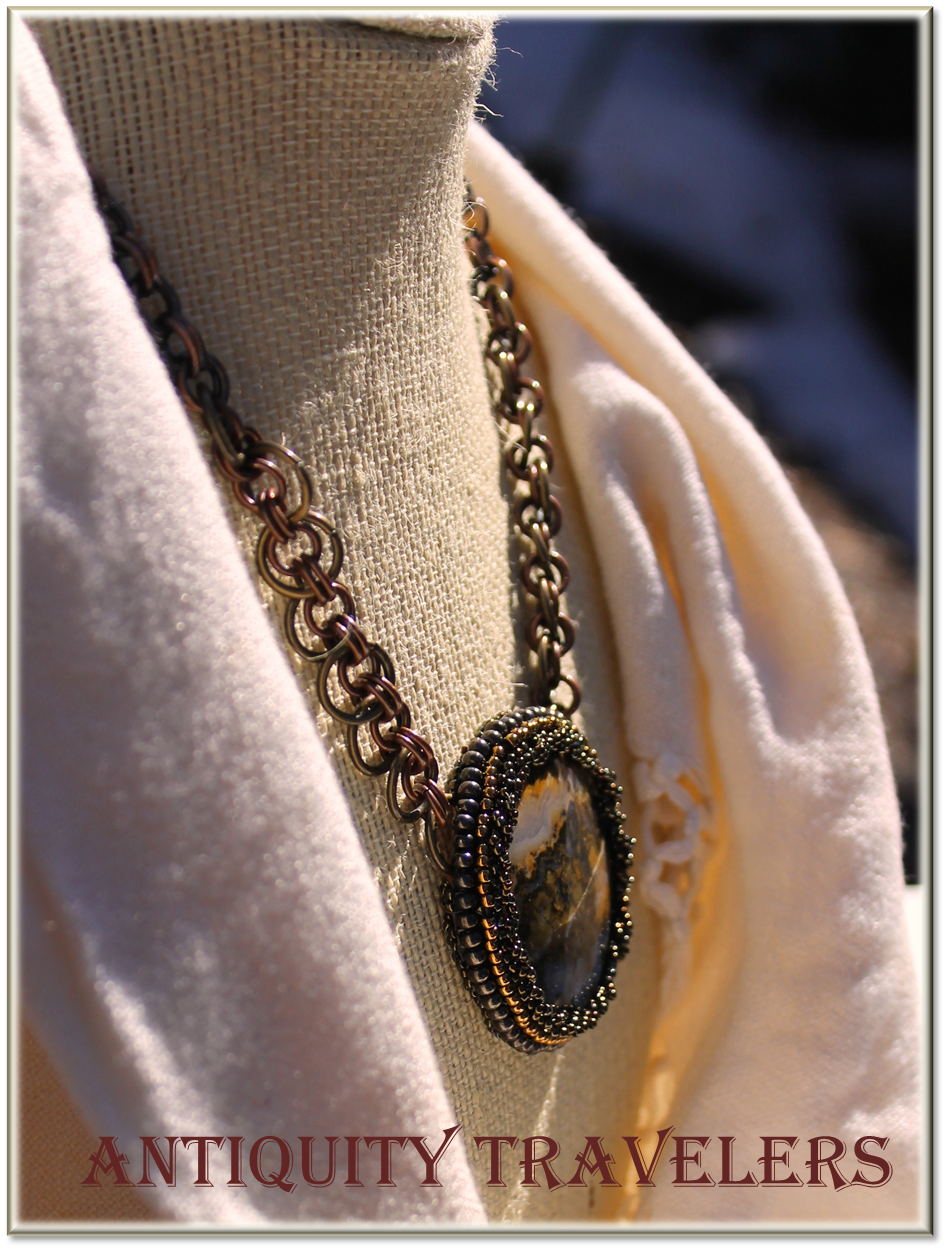 The one she sent me I think is just beautiful. It is a plume agate and seems to have a landscape pattern to it. In doing a bit of homework on this type of agate I found that there are several large areas in Eastern Oregon and Idaho (the Owyhee Mountains and Graveyard Point) where they mine this type of agate. They say that plume agates are a seam agates and get their names from the plume like shapes from inclusions in the stones. Many are cloudy plumes, but you'll find brown and black mineral inclusions as well. One 'rock hound' said that when the agate is exposed to the elements it tends to make it look fractured, stained and cloudy. However these stones form, they make for some gorgeous eye candy to bead around.For my cabochon I decided to use a mix of 'mineral' colors in gun metal grey, copper, brass and gold to highlight all those beautiful inclusions in Therese's stone. I tried (for quite some time) to add leather for the strap, but it just wasn't going to happen. I gave up and went with a simple chainmaille instead which gave this piece just the right balance and substance that I was looking for.