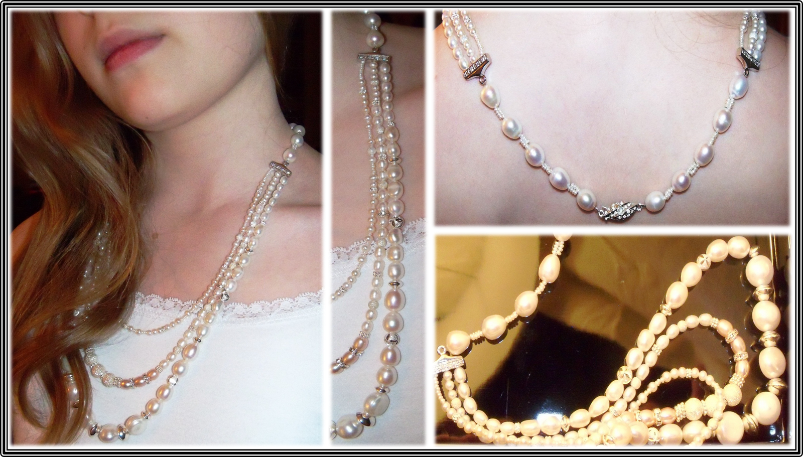 A year ago today, my friends Tony and Melissa were married in a beautiful outdoor wedding. She looked stunning in a gorgeous J. Crew, long summer sheath (Seraphina Gown). And she was wearing a triple-strand pearl necklace that I created for her. Yep, she trusted me with her wedding necklace! In fact she said "surprise me, I trust you." Now mind you, she is a clothing designer by trade, so this blew me away! She asked for pearls, lots and lots of them, with a bit of silver and bling (earlier post). I was so thrilled that she liked what I created. She declared "perfect" when I handed her the final design.